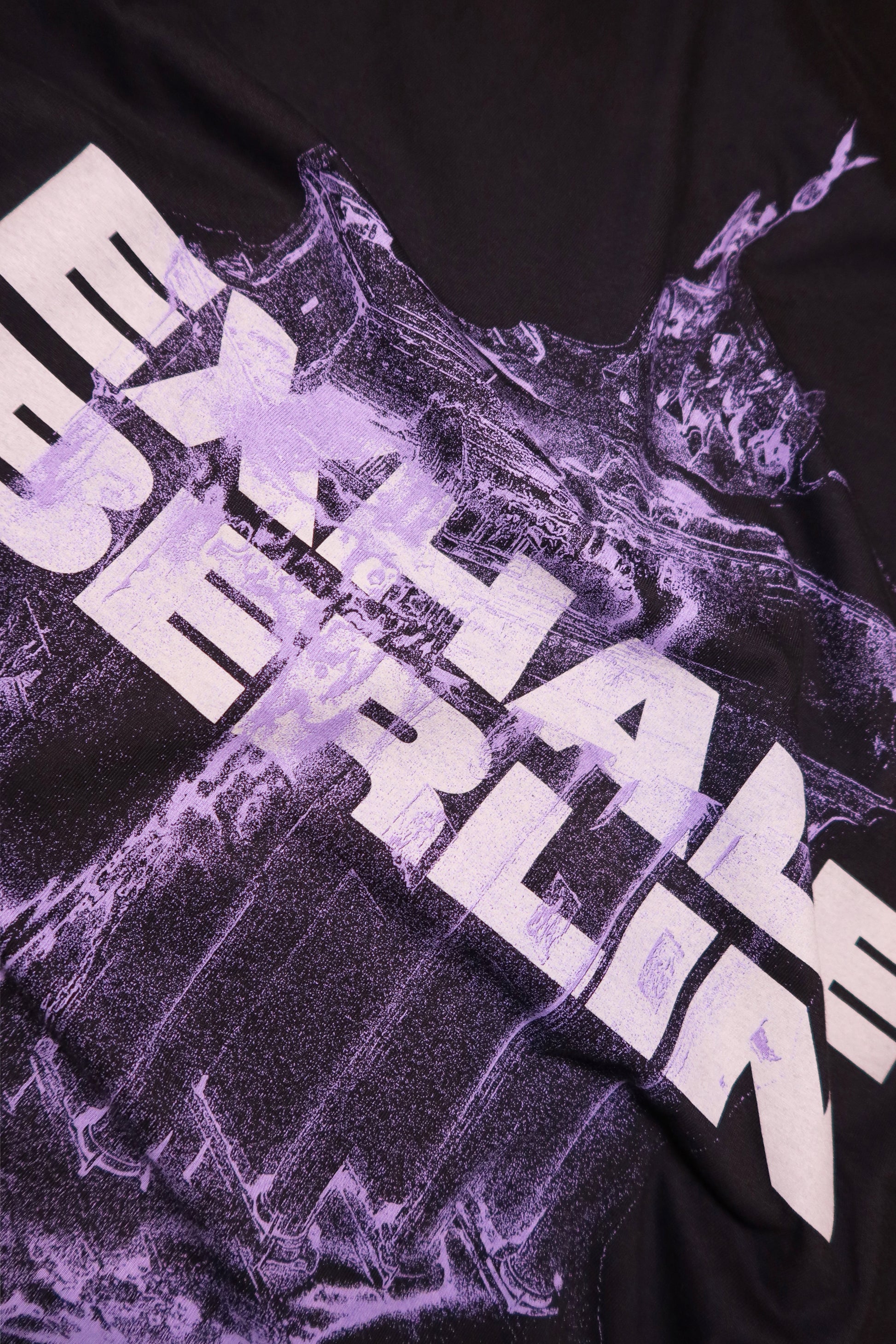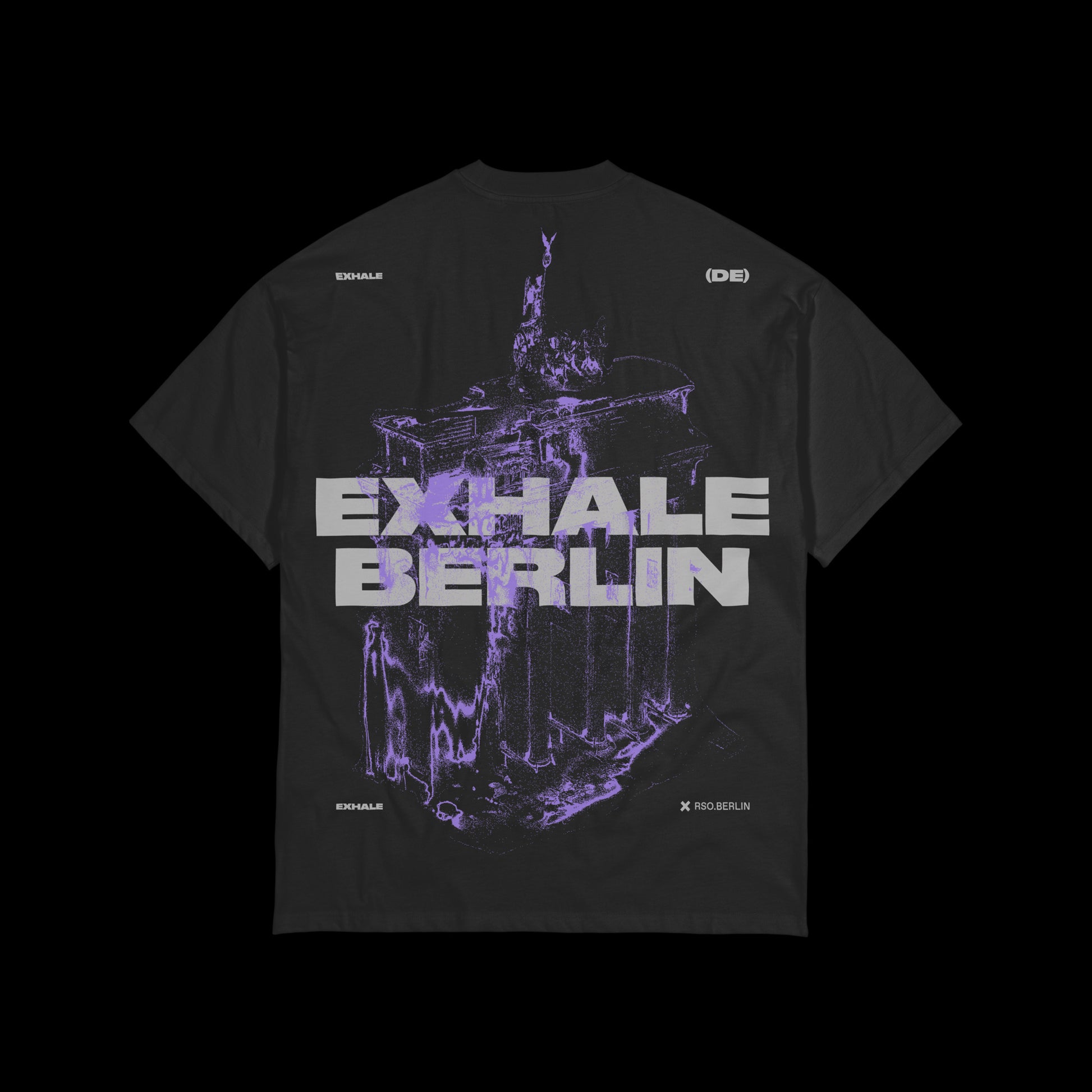 The back design features a distorted, digital rendering of the monument in vibrant purple tones, paired with bold "EXHALE BERLIN" lettering - a tribute to the city's powerful energy and underground spirit.